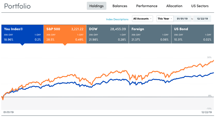Performance numbers. According to Personal Capital, my portfolio went up +19% so far in 2019. I see that during the same period the S&P 500 has gone up +29%, Foreign Developed stocks up +21%, and the US Aggregate bond index was up about +10%.