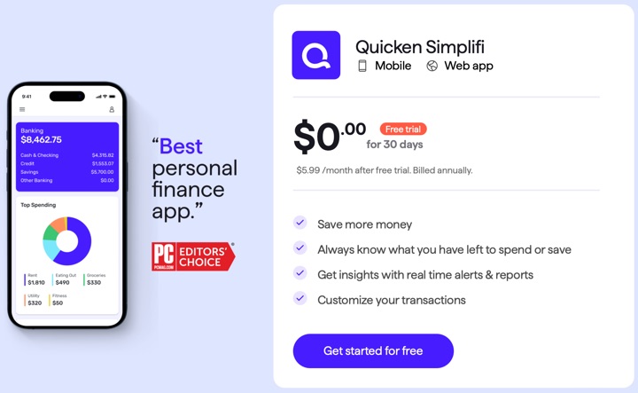 Quicken Simplifi is running a free 30-day trial of their personal finance app. Simplifi is their app-first “Mint-like” software that aggregates all your accounts daily, tracks spending, categorizes for budgets, analyzes investments, and all that. They also still offer their desktop-first Quicken Classic software (although Simplifi has a web interface and Classic has a companion app…). After the free trial, the cost is “$5.99/month, billed annually”, in other words… $71.88 a year. They’ll want your credit card at sign-up, so be sure to set a calendar reminder to cancel. They’ll tell you the date.