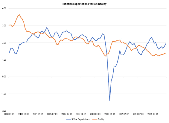 Here’s how the expected inflation and actual inflation compared for 5-year periods since 2003. For the most part, they have been pretty close:
