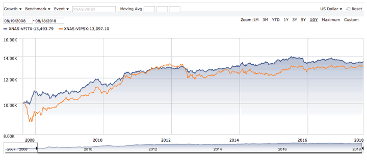 Here’s a 2008-2018 Morningstar chart comparing the growth of $10,000 between the Vanguard Intermediate Treasury Fund (VFITX) and the Vanguard Inflation-Protected Securities Fund (VIPSX). You can see while there is definitely a difference – sometimes one leads, sometimes the other – but over the last 10 years the net return has been very similar. Again, inflation has not been much higher (or a lot lower) than expected.