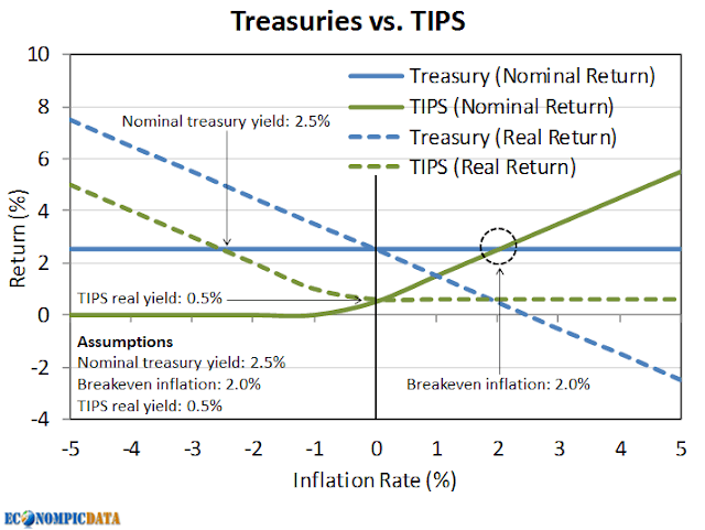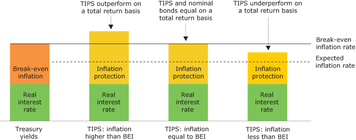 If inflation meets the market expectations, then TIPS and Treasuries will have the same return. If actual inflation is higher than the (expected) breakeven inflation rate, then TIPS will pay more than the regular Treasury bond. If actual inflation is less than the (expected) breakeven inflation rate, then TIPS will pay less than the regular Treasury bond. Here’s a simple graphic from AAII: