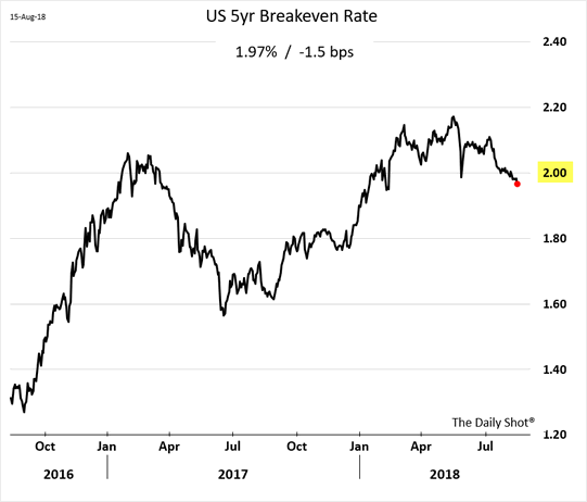 Do you think future inflation will be higher than the current expected number? Here’s the 5-year breakeven inflation rate for the last couple of years. Via WSJ Daily Shot.