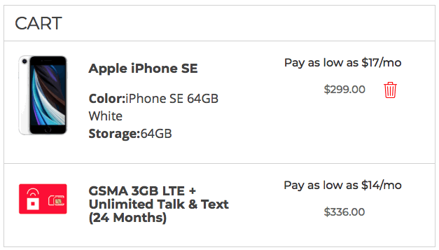 Example: iPhone SE + 2 years of Unlimited talk, text, and 3 GB LTE data = $299 + $336 = $635 for 2 years. This works out close to $26.50 per month. Breaks down to $12.50/month for the phone and $14/month for service. GSMA network (AT&T). You can upgrade to 7GB LTE for $20/month, 15 GB LTE for $30/month, or Unlimited LTE for $45/month. You could also downgrade to 1,000 minutes, unlimited text, and 1 GB LTE data for $10/month. After you reach your LTE data allotment each month, you still get unlimited data at slower 2G speeds. Looks like a little bit more if you finance it over monthly payments. UPS Ground shipping is free.