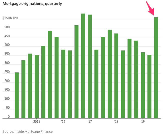 Even before this most recent rate drop, mortgage originations had already spiked, per the WSJ). A swing from 5% back down to 3.5% will create even more.