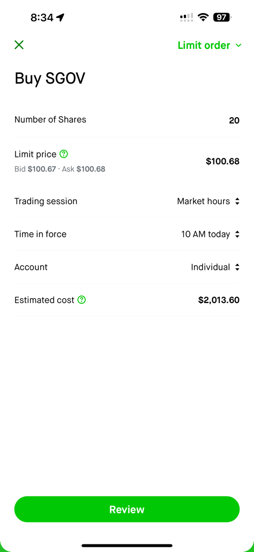 I’m not sure I’ll keep doing this, but I’ll try it out for a couple months. I deposited a little over $2,000 of new cash into my existing taxable brokerage account (which previously just had a bit of stocks from past bonuses) and put in a limit buy order to 20 shares of SGOV, which is an ETF that holds short-term US Treasury Bills.