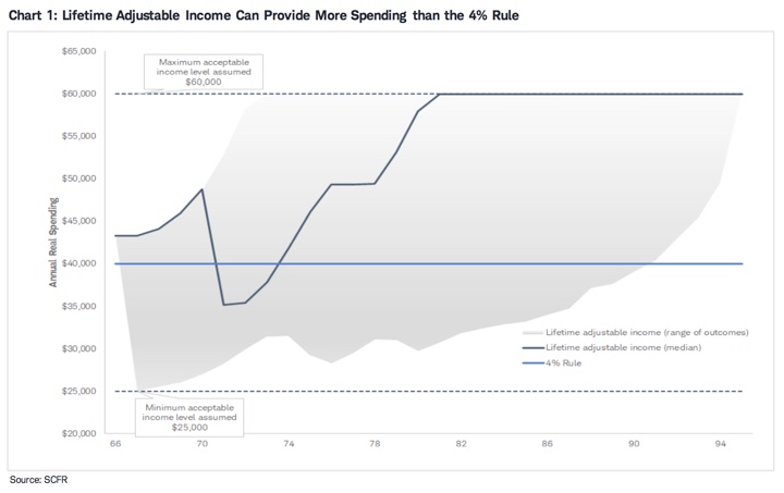 In this memo, we compare a flexible withdrawal strategy to the static 4% rule. We recommend a lifetime adjustable income strategy, described in this paper, that can be put into action using an annually updated financial plan, using technology or an advisor. Doing so may help increase spending early in, and over a long, retirement and help ensure your money lasts.