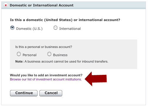 If you use certain banks using CashEdge, you can look for the “investment accounts” options as shown here. Scottrade is one of the participating brokers, although you still need your checking account number.