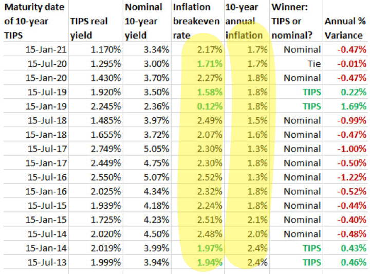 It turns out that 10-year TIPS bonds that matured over the last several years mostly underpeformed regular nominal Treasuries, as the actual inflation turned out to be less than the breakeven inflation rate. David Enna of TIPS Watch created the interesting chart below comparing the final performance of TIPS vs. nominal Treasury bonds maturing over the last several years, where green means that TIPS “won” and red means TIPS “lost” in terms of total return. I removed some columns and highlighted the initial breakeven rate (the market-based guess) and the actual inflation rate.