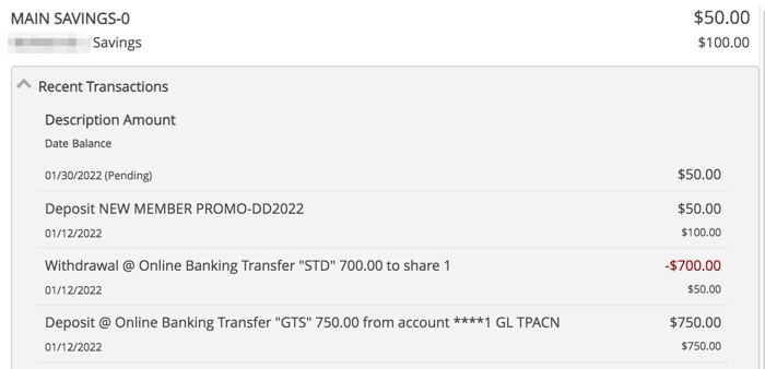 During the application, I was able to charge my initial opening deposit up to $750. This was classified as a purchase on my credit card (worth $15 at 2% cash back). Note that you must keep $50 that is “untouchable” in your Share Savings account as long as you are a member, which is a bit higher than that of other credit unions (usually around $10 to $25).