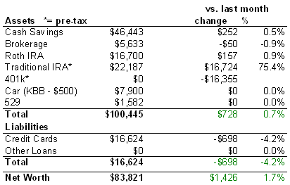 Our non-retirement funds went up $959 to $44,993, another 1% closer to our mid-term goal of $100,000. Although we are falling off the pace needed to reach that goal, moving forward is good. Overall net worth increased by a bit more, about $1,500, mostly due to retirement investments. The 401k column is empty now since it is all in a Traditional IRA now after the completion of my rollover to Vanguard.