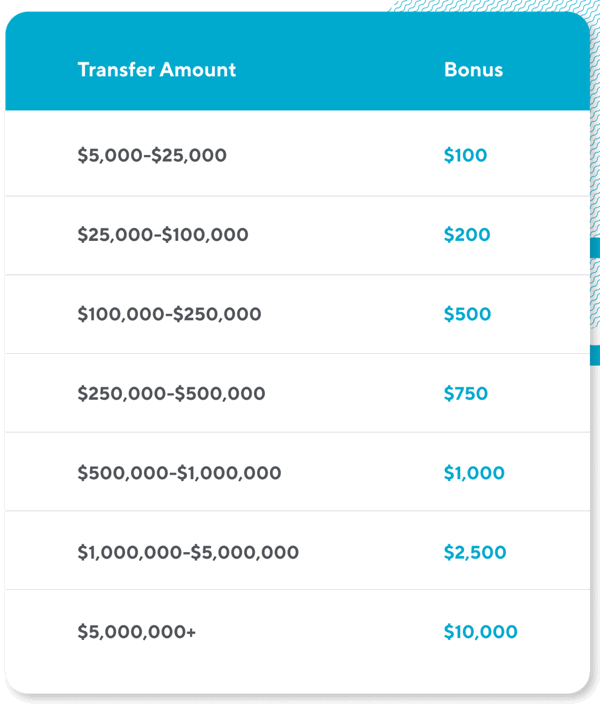 - $2,500 bonus with $1,000,000+ to $1,999,999 in new assets