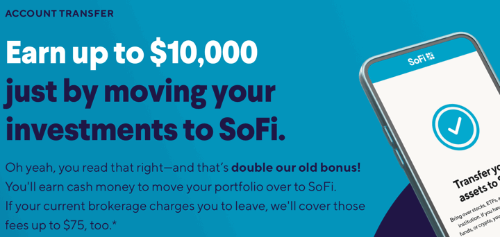 SoFi Invest is offering an increased ACAT transfer bonus up to $10,000 for transferring in new assets. Some of the tiers are double what they used to be, but the minimum holding period was also increased. Valid for both taxable brokerage accounts and IRAs (Traditional, Roth, or SEP).
