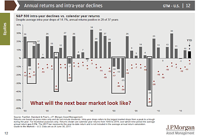 In addition, here is a JP Morgan AM slide that shows that sharp intra-year drops are much more common than you might think from just looking back at annual returns: