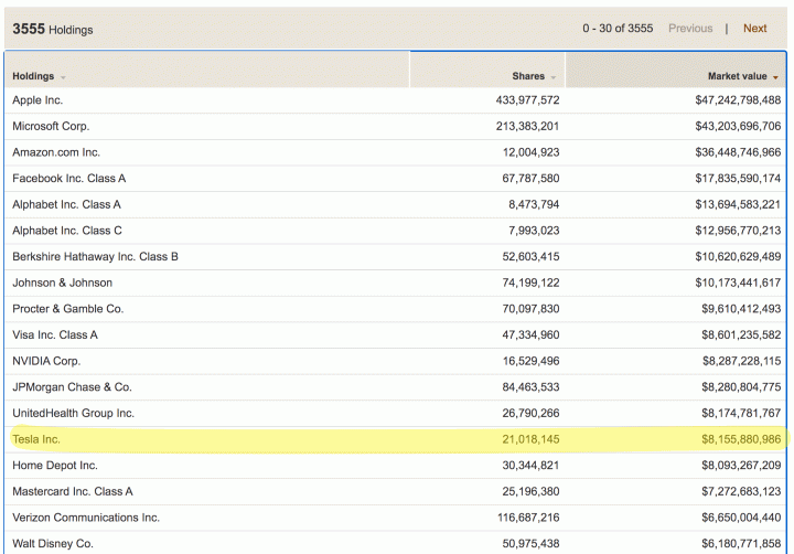 Meanwhile, the Vanguard Total Stock Market fund (VTI) will have to do… nothing. VTI and VTSAX already owned Tesla way back when it closer to $5 a share instead of waiting until it was $600. VTI aims to own the entire US stock market according to market cap. Large-cap, mid-cap, small-cap. Growth and value. Low-vol and high-vol. 3,555 companies, all the way down to Patriot National Bancorp (PNBK) worth only $31 million. Here’s a screenshot of the holdings as of the end of last quarter, October 31st, 2020.