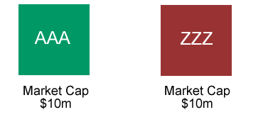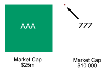 Things are going along, but then a new medical study finds that ZZZ’s widgets cause cancer, and it turns out the CEOs have been covering this up for years. ZZZ tanks, and is now trading at a penny per share, while everyone is switching to AAA’s reliable widgets. AAA goes up to a market cap of $25m ($25 per share).