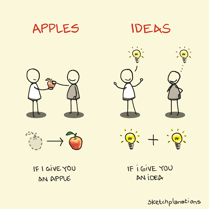 If you have an apple and I have an apple and we exchange apples, then you and I will still each have one apple. But if you have an idea and I have an idea and we exchange these ideas, then each of us will have two ideas.