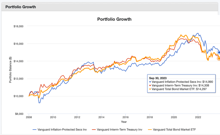 I hold close to 50/50 US Treasuries and TIPS for the bond portion of my portfolio. This is an area where my portfolio differs significantly from most “model portfolios” you’ll find from the major fund companies and robo-advisors. While buying more TIPS recently due to their historically high real yields, I decided to run a quick backtest comparing three intermediate-term fund options: