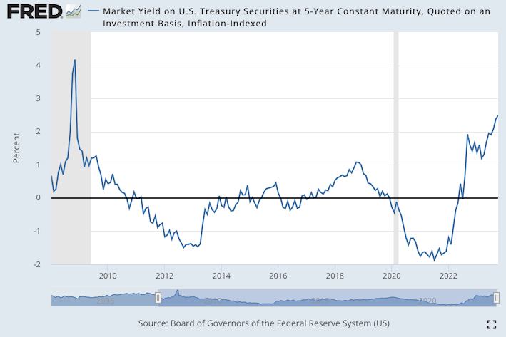 Here is the real yield for 5-year TIPS during the that time period (2008-2023). While there was a brief spike during the 2008 financial crisis, I would guesstimate the average real yield during this entire period as… zero.