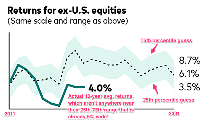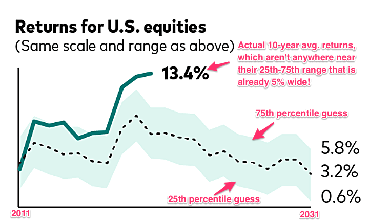 For US Stocks between 2011-2021, their forecast in 2011 was roughly between 6% and 12% annually for US stocks, for a median around 9%. That a wide band! The actual return? 13.4%. As of early 2025, we are still outside their confidence bands.