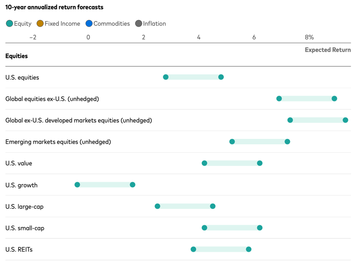 Vanguard recently released their most recent annual 10-year forecast as of mid-November 2024 (effectively the beginning of 2025). The beginning of the year is the time for forecasts, and that also makes it a good time to remind ourselves how badly they can be wrong and how you shouldn’t really use them for anything.