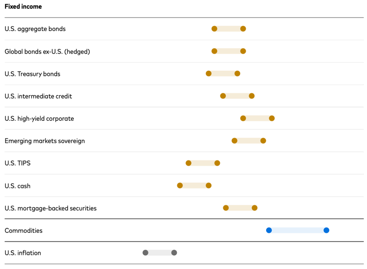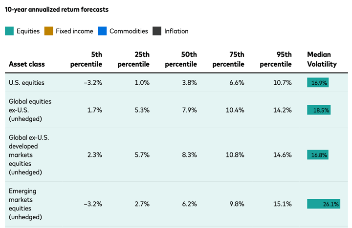 Notably, the 10-year median return forecast is 3.8% for US stocks, 7.9% for Global ex-US stocks, and 4.8% for US total bond. This table includes their percentile confidence ranges.