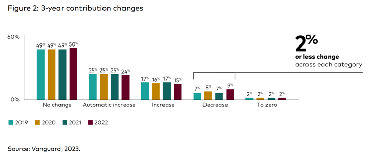 Even though the average balance dropped by 20% in 2022, there wasn’t widespread panic or account changes. In fact, nearly 40% increased their deferral rate: