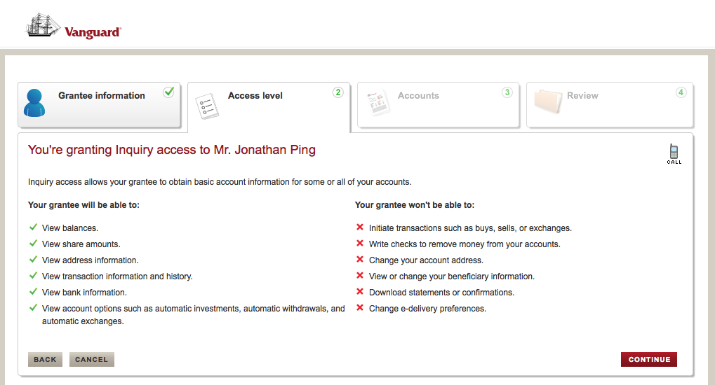 Vanguard lets you grant direct view-only access another Vanguard account holder. With this option, now my wife’s IRA holdings show up on my primary account view right next to my own IRAs. So convenient! As the family’s CIO, I now only have to log into the other account to make our annual IRA contribution. This is exactly what I’ve wanted for a while.