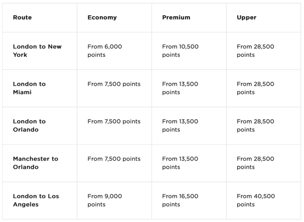 You can redeem Virgin points for free flights on Virgin Atlantic Airlines, including Economy, Premium Economy, and Upper (First) Class. There is no fixed award chart, but you can use this Reward Seat Checker tool to see what is available. Here are the best case scenarios for a Saver reward, which are very limited. You’ll also have to watch out for carrier-imposed surcharges, which are not included.