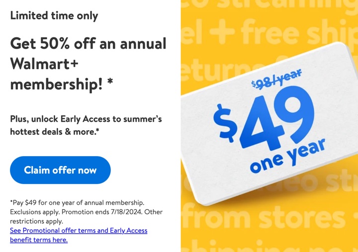 Walmart+ Annual Membership 50% Off ($49 Savings)