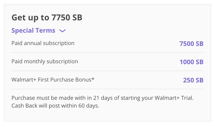 MyPoints $75+ back. Search for “Walmart+” on the MyPoints rewards site, and you’ll see they are offering 12,000 points on a paid annual subscription, plus 500 Swagbucks on your first Walmart+ purchase. Purchase must be made with in 21 days of starting your Walmart+ Trial. Cash Back will post within 60 days. There is also a $10 new member bonus via MyPoints referral link.