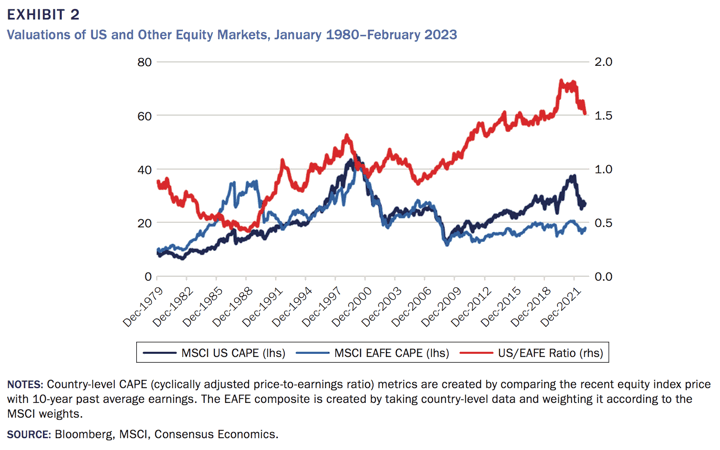 International diversification has hurt US-based investors for over 30 years, but the long-run case for it remains relevant. Both financial theory and common sense favor international diversification, which is buttressed by empirical evidence that is very supportive at longer horizons and for active strategies. Finally, it would be dangerous to extrapolate the post-1990 outperformance of US equities, as it mainly reflects rising relative valuations. If anything, the current richness of US equities may point to prospective underperformance.