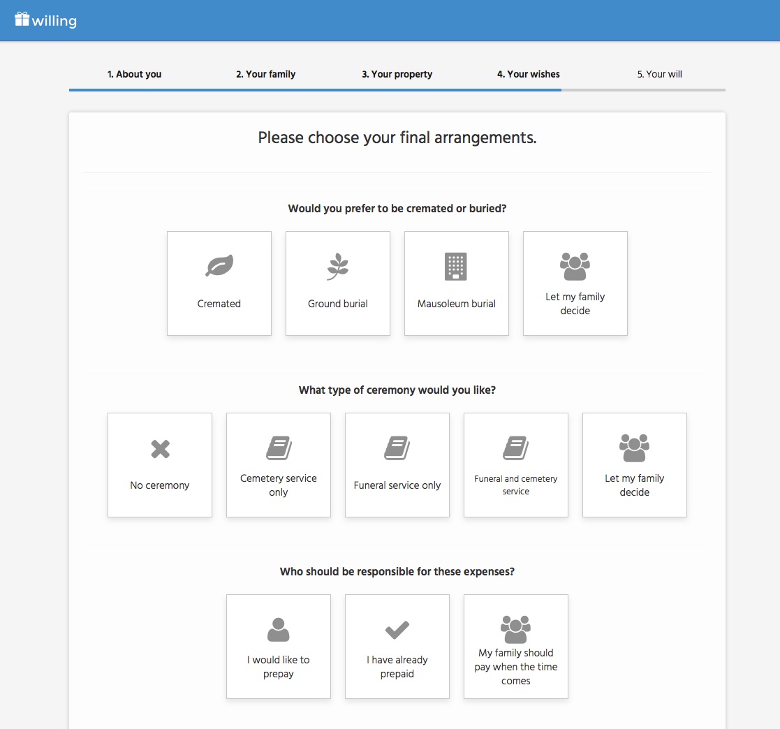 At no point do you see any advertisements nor do they ask for any payment information. The last screenshot does provide a hint as to the future revenue model for Willing – perhaps they will set up a way for you to prepay your funeral expenses (relieving your family of some stress and money) and get a little cut of that. That sounds reasonable to me if they are providing the will for free. Of course, if you live another 50 years, will you even remember shelling out that money?